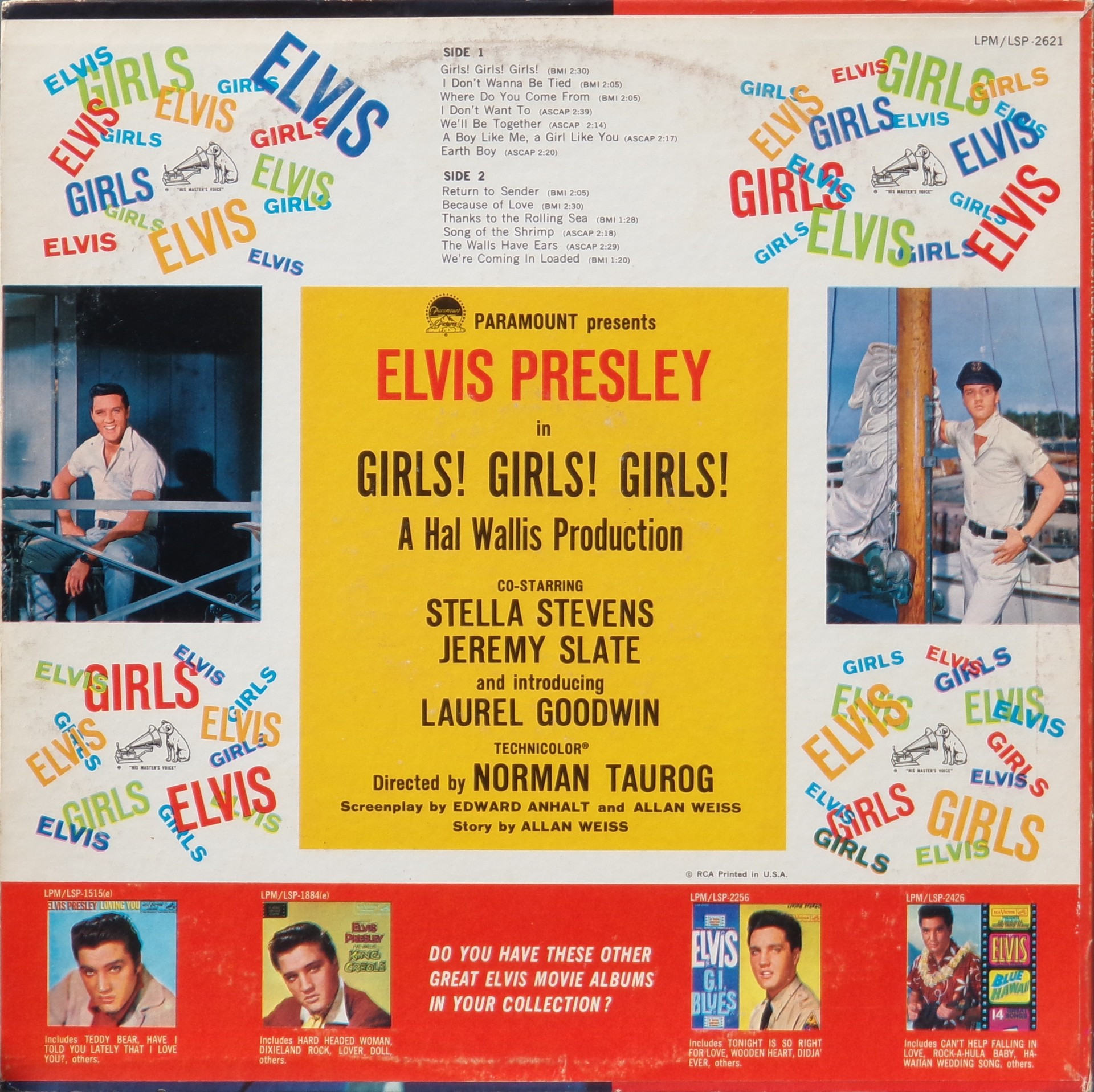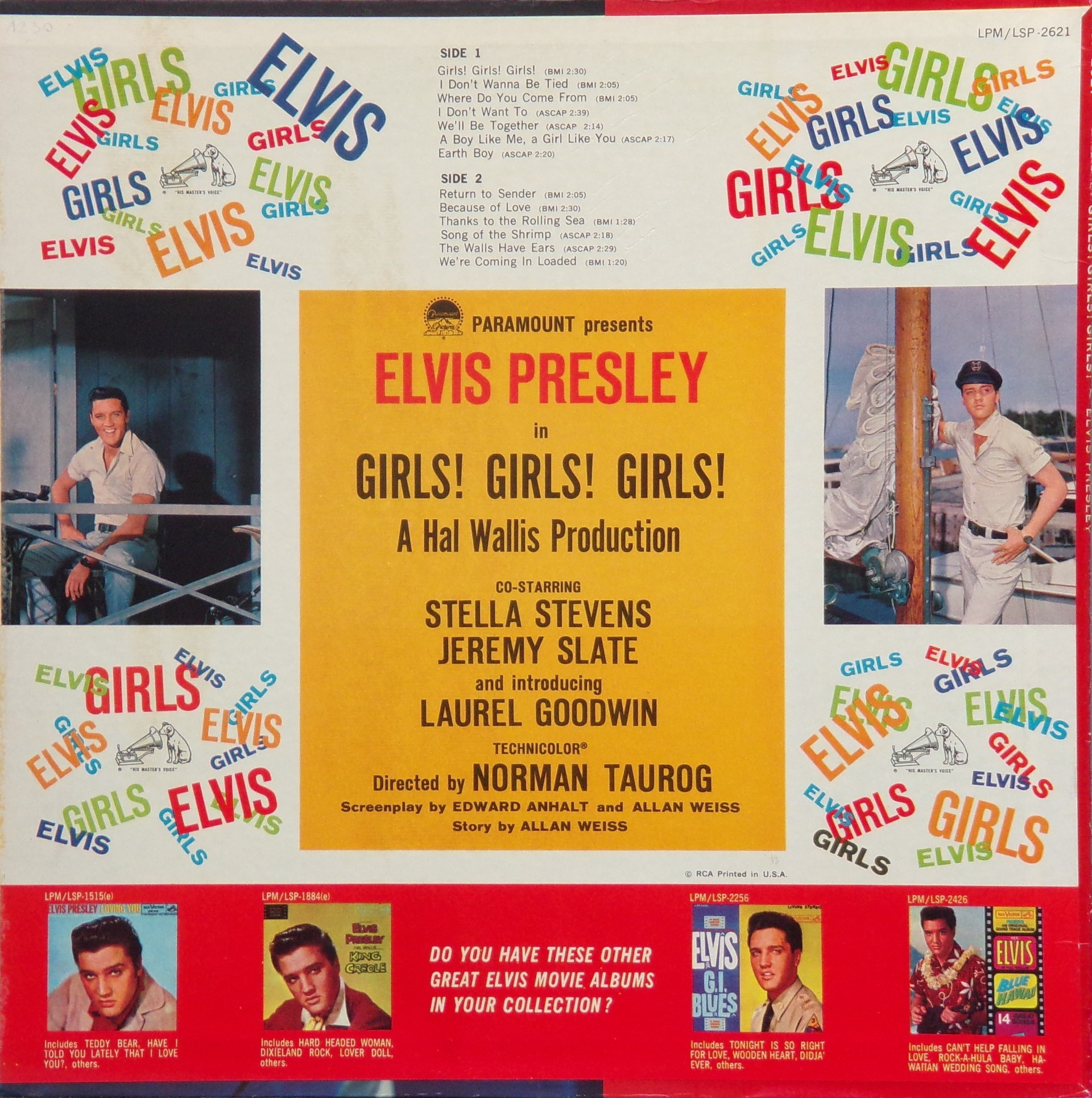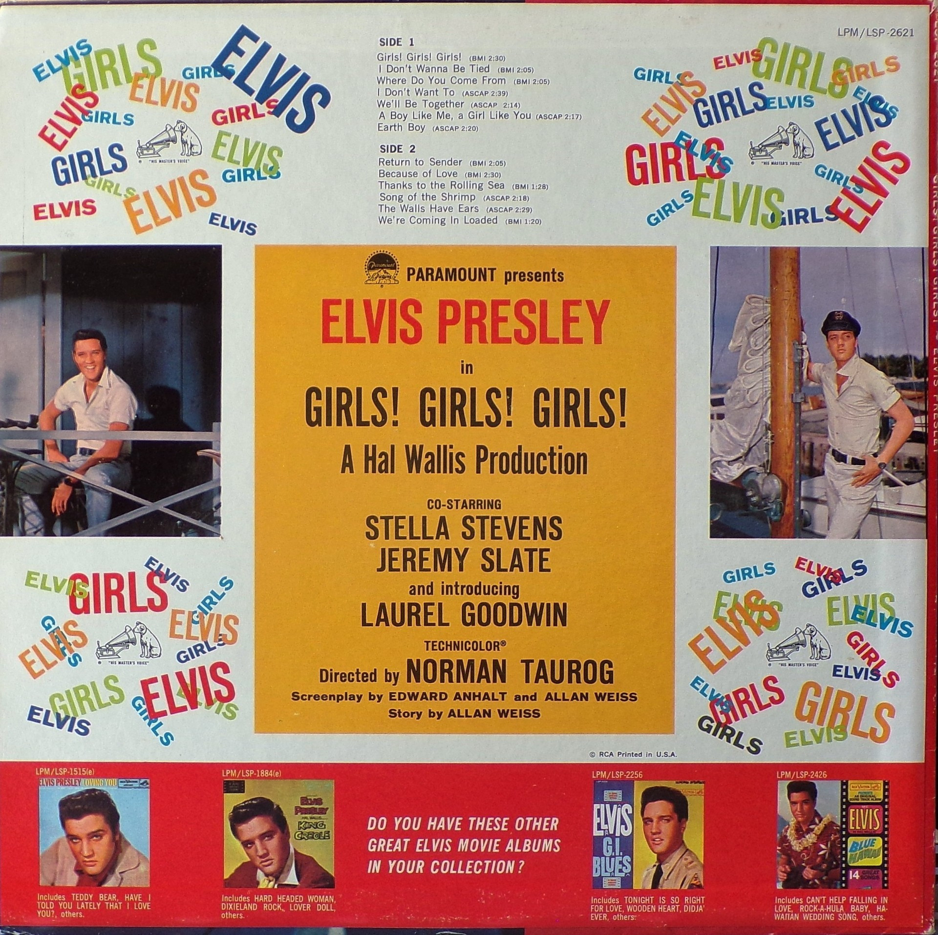 Rear Cover : 2 Elvis photos from Girls! Girls! Girls!. Advert for 4 other albums. Catalogue number top right LPM/LSP 2621.