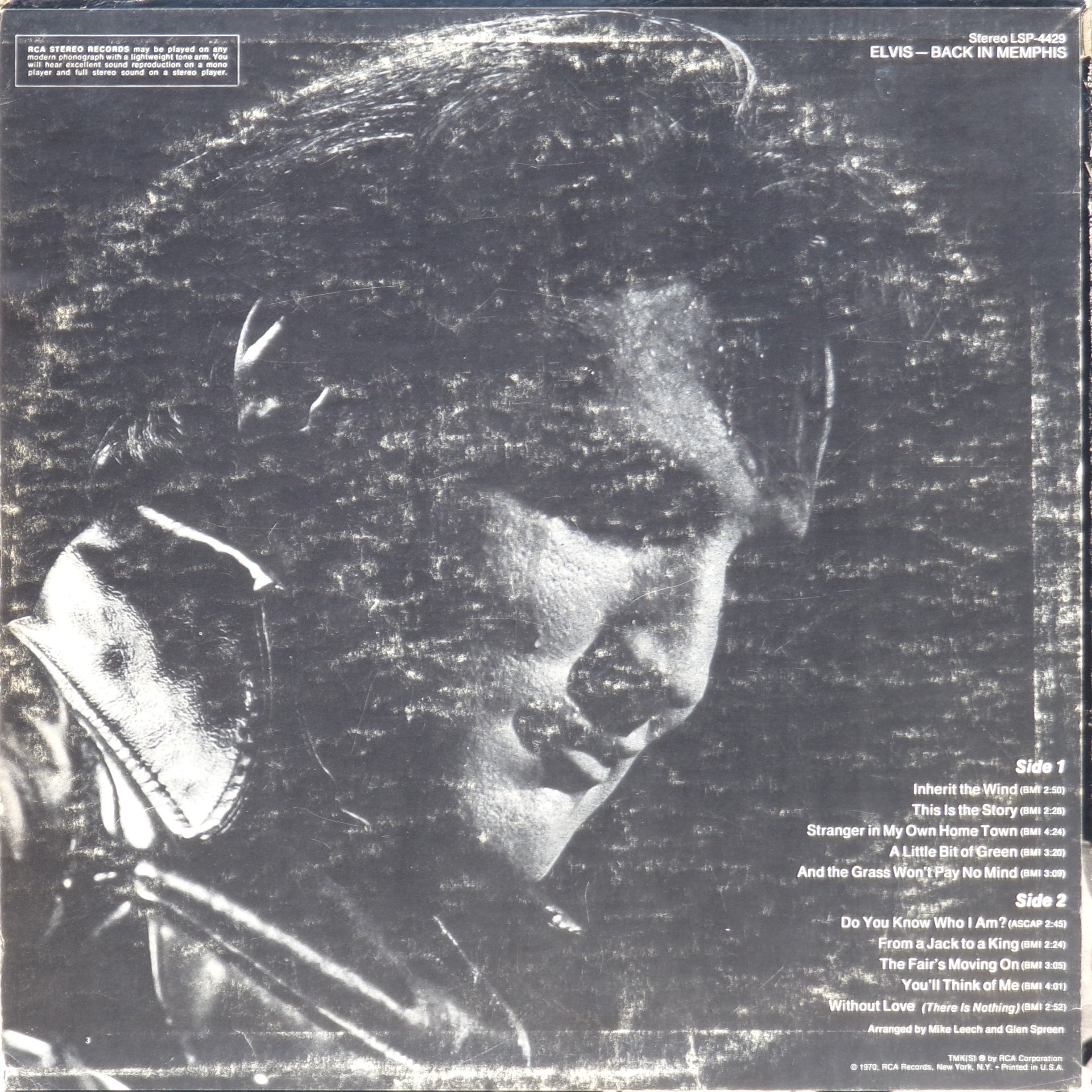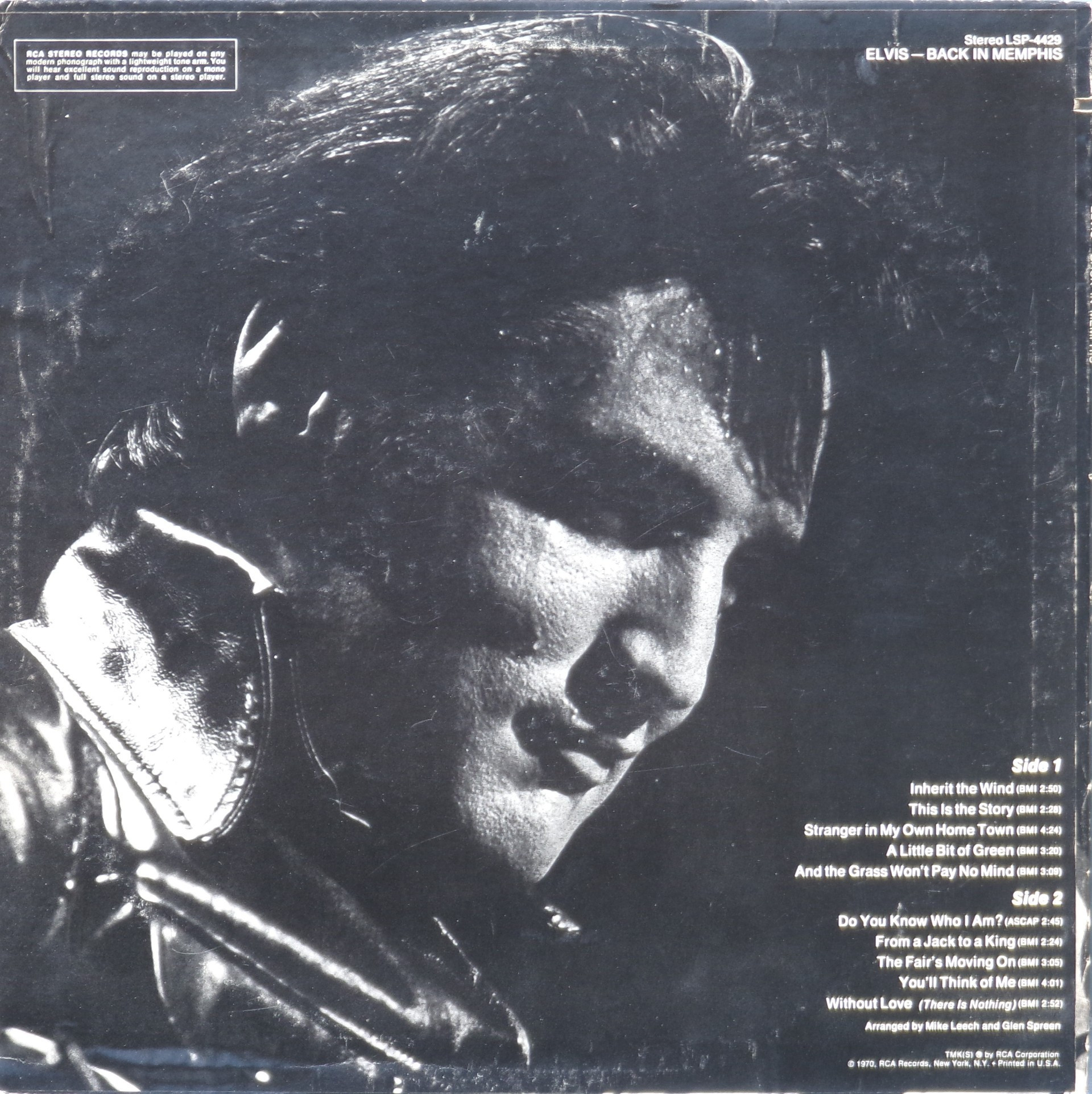Rear Cover : Photo of Elvis. Catalogue number top right. Printed in U.S.A. bottom right.